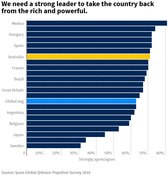So it’s no surprise that a recent survey by Ipsos Global revealed widespread distrust of traditional politics: More than 70 per cent of Australians believe the nation “needs a strong leader to take the country back from the rich and powerful”.
