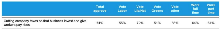 Despite the general foolishness of the left, a survey shows 51 per cent of Greens voters support a company tax cut. Surprisingly sensible for that lot. Further, 55 per cent of Labor voters also support the tax cut. More soundness.