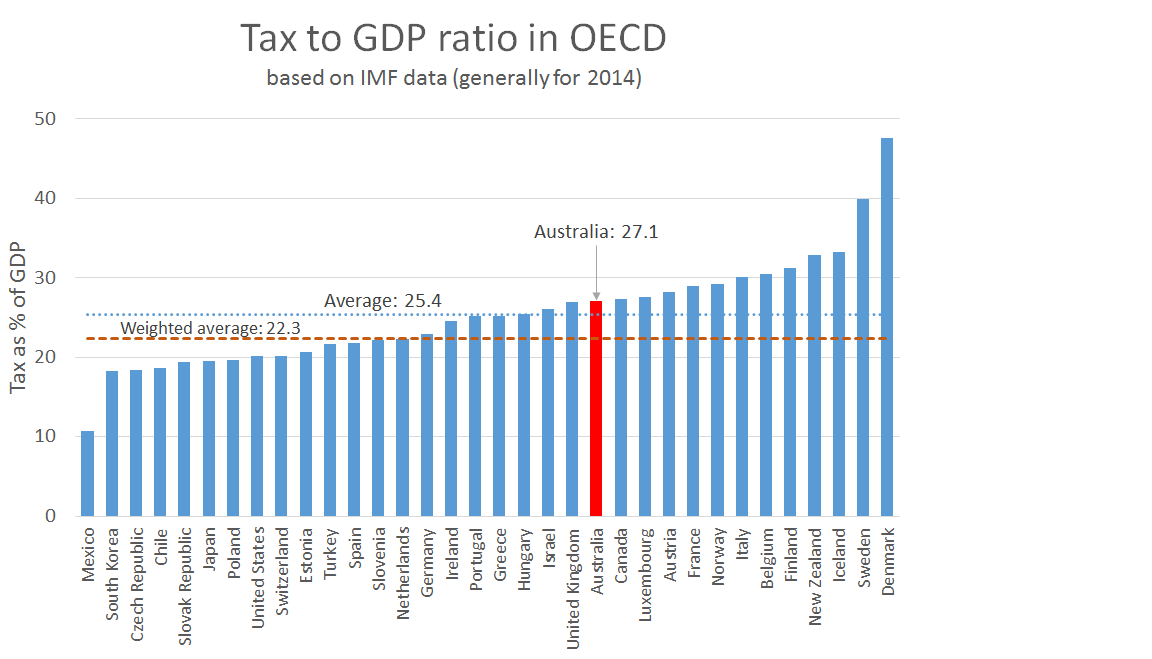 The OECD report says tax as a share of the Australian economy was sixth lowest in the OECD. And our tax rate is well below the (unweighted) average. This is shown in the graph below.