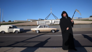 It’s hard to imagine anyone thought the sight of Bob Katter dressed as the Grim Reaper, being slowly circled by vintage Holden cars, would make a serious policy argument. Katter’s protest was in support of his motion calling for the re-establishment of an Australian car manufacturing industry, supported by the federal government (inevitably).