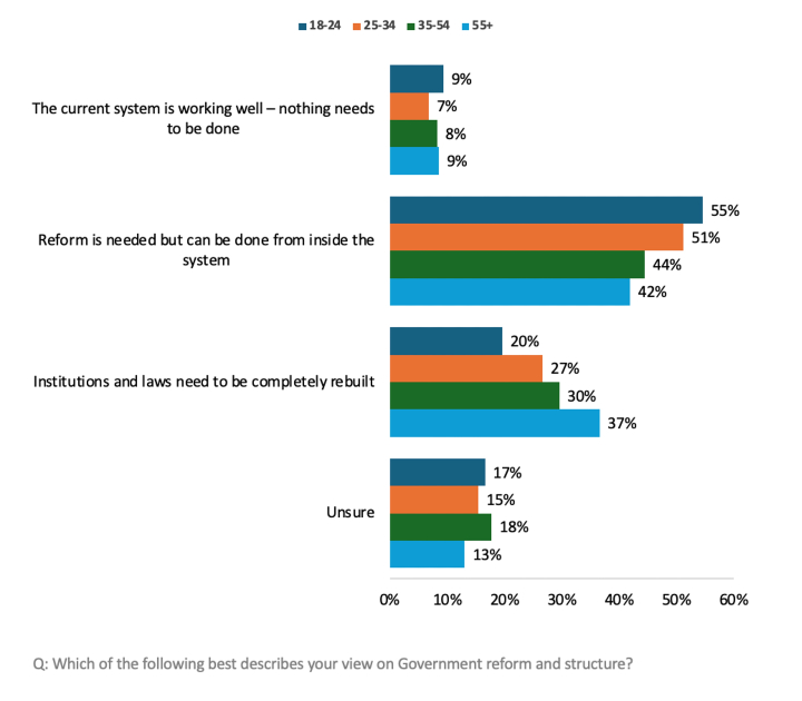Across these groups, housing affordability, financial insecurity, and time scarcity dominate perceived barriers. While most young Australians have a low level of trust in government, most broadly favour reform from within the system rather than revolutionary change. Those who favour more drastic change are the most precarious, who feel they have little control over their destiny.