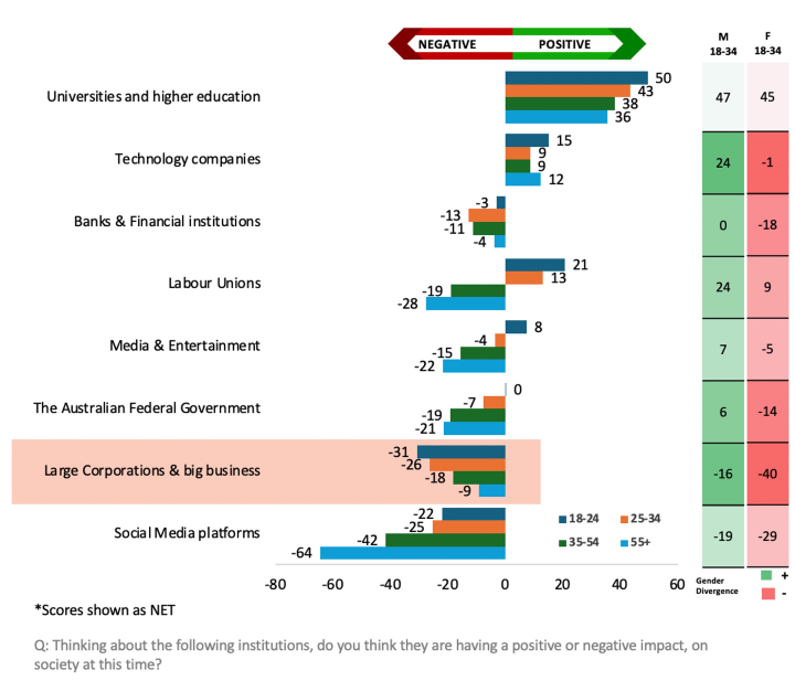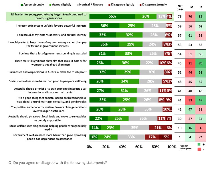 Quantitative research was then undertaken through Spectre Strategy, asking a set of questions designed to uncover the hopes, concerns, and values of this age range. The survey sampled 2011 voters, of whom 1246 were aged 18–34, from 4–18 November 2025. The data has been weighted to be representative of Australian voters. The margin of error is +/- 3% for topline results.