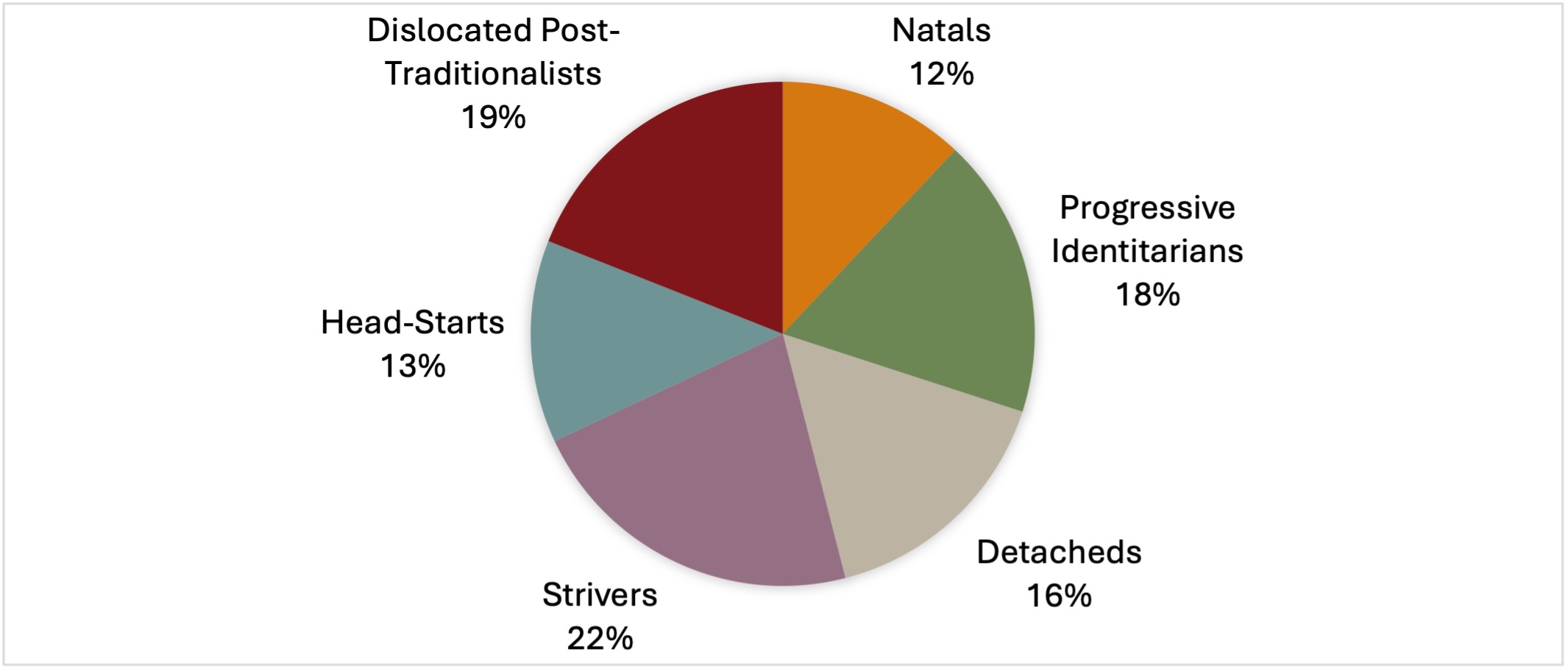 [15] It should be noted here that NATALs skew results in the opposite direction, in some cases balancing the Progressive Identitarians out. Without the Progressive Identitarians or the NATALs, LGBTQ+ identification in this age group would be 11% – neither the high of 40% among Progressive Identitarians or the low of 4% among NATALs.