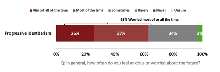 Progressive Identitarians are highly anxious, with poor emotional and mental health, and a low sense of personal agency. They report lower levels of life satisfaction than other groups. They perceive government policies as having a strongly negative impact on all of their areas of aspiration.