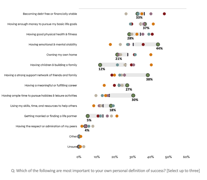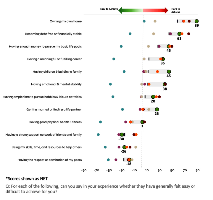 This financially secure cohort aspires above all to good physical health and fitness (39%), becoming debt free (33%), and home ownership (31%). With their fundamental needs met, they are far more likely than others their age to aspire to use their skills, time, and resources to help others (19%).