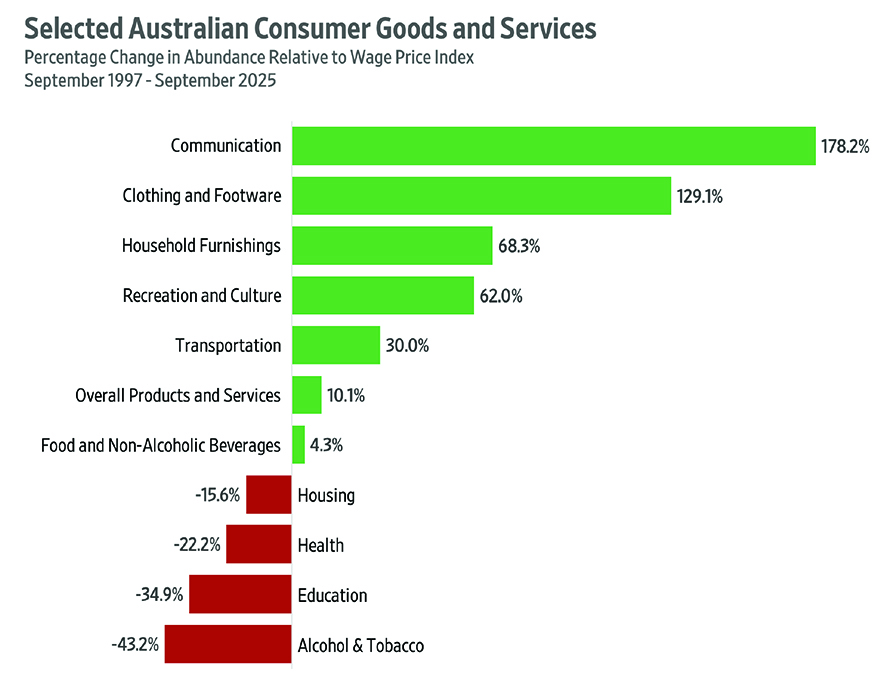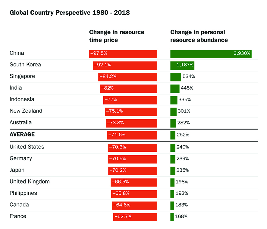 Australia is a little above average — its abundance over that period between 1980 and 2018 has increased by 282%. Time prices fell by 74% which was just about average. But Australia performed better than the United States, Germany, Japan, UK, Canada and France.