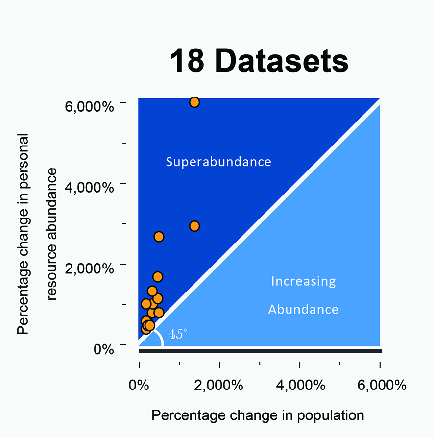 The interesting thing that emerged as we did our study, is that abundance can increase at two different rates. It can increase at a lower rate than population growth and a higher rate than population growth. The 45-degree line shows what happens when abundance and population grow at the same rate. But when abundance grows at a faster pace than population, you have what’s shown in the chart — what we call ‘superabundance’.
