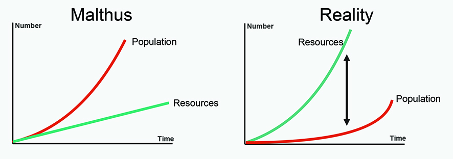 Returning to the views of Malthus, the reality looks different. It seems that resources are increasing at a faster pace than population, and the gap between them can be explained by the new knowledge produced in the human mind.