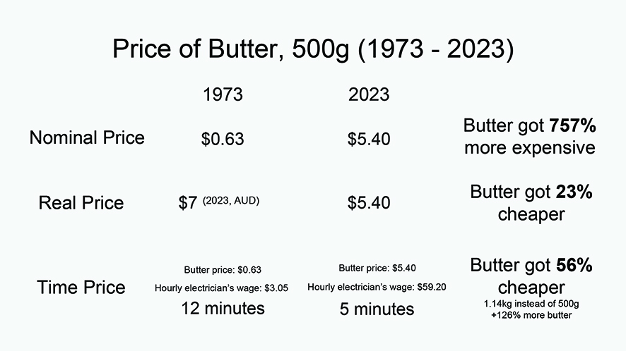 Below is an example of how we would calculate the time price of butter. Looking at Australian government statistics, in 1973 500g of butter cost 63 cents. By 2023 it had risen to $5.40. So, in nominal terms, butter got 757% more expensive. And very often, when you open a newspaper, you will always read that things have never been more expensive. But it’s been 50 years, let’s adjust for inflation: 63 cents in 1973 is equivalent to $7 in 2023 and we know that butter only cost $5.40 in 2023 — so that means butter actually got 23% cheaper, adjusted for inflation.