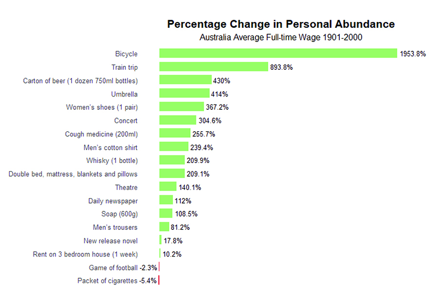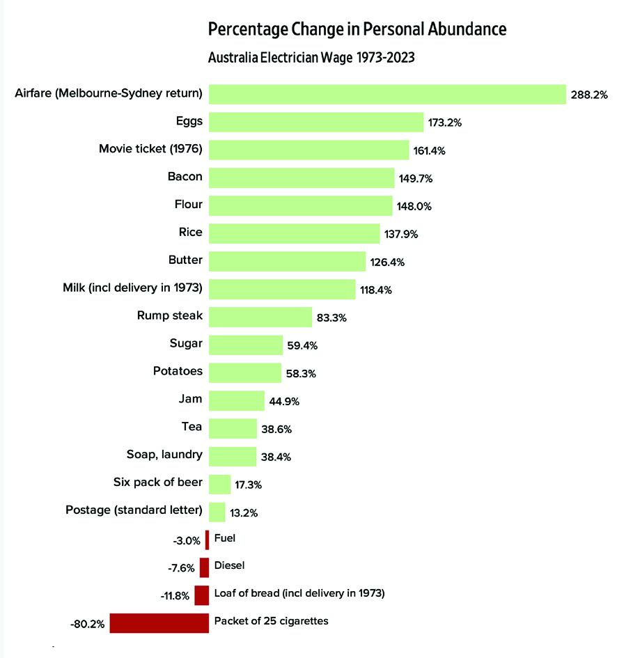 Over the past 50 years, you can see that looking at an airfare from Melbourne to Sydney, for example, our electrician can now get almost three tickets for the price of one. We can see similar things happening in terms of eggs, bacon, flour, rice, butter, milk, steak, sugar, potatoes, jam, tea… almost everything has gotten cheaper.