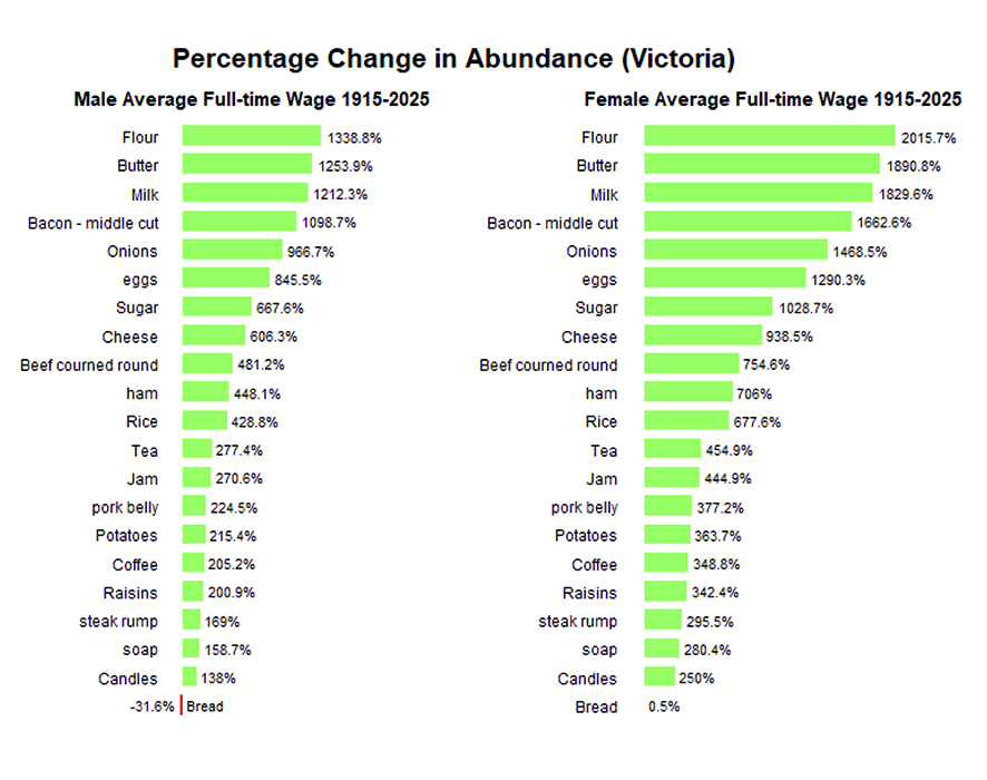 Women have experienced more abundance than men. That means that their wages have grown at a faster pace than men’s wages. That explains why flour, for example, relative to female wages is 2,000% more abundant but relative to male wages, it’s only 1,300% more abundant.