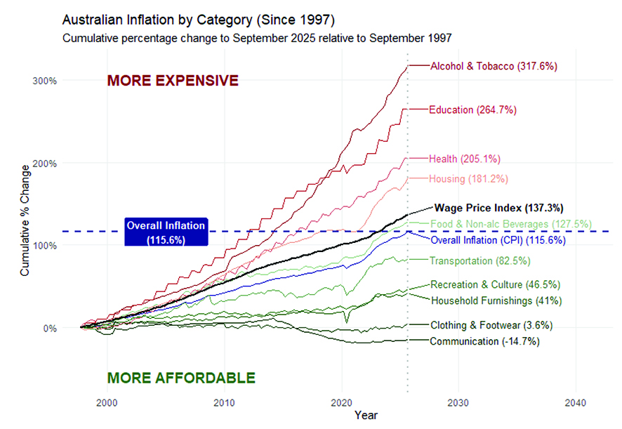 Unfortunately, not everything is getting more abundant. Below is the data for Australian inflation categories since 1997 all the way to September 2025.